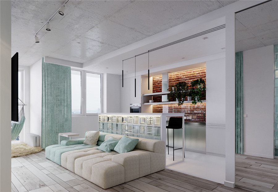这套小户型的配色方案是基于一种蓝绿色的基调。就像里面使用的鲜明的春天色彩一样,这套公寓的布局营造出一种轻松活泼的氛围,让人放松、充满活力。
